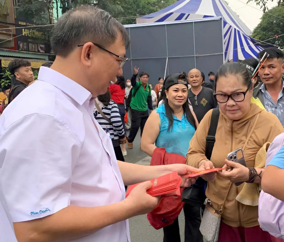 Ông Trần Hùng Phong (bên trái) lì xì cho người dân về quê đón Tết.