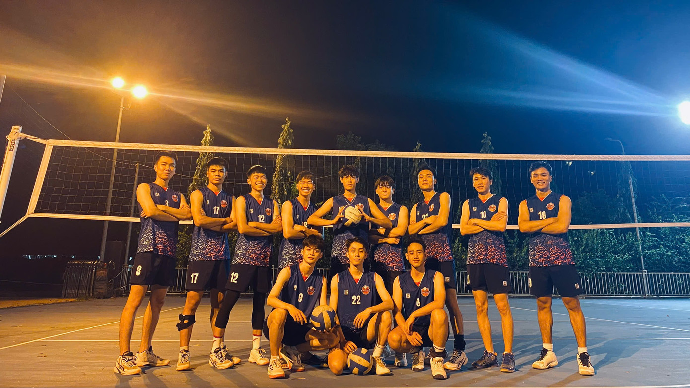 Hoàng Long (đứng giữa, hàng trên) cùng đội tuyển bóng chuyền nam trường ĐH FPT. (Ảnh: NVCC)