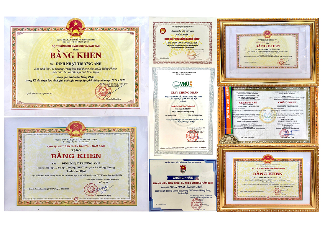 Một số thành tích của Đinh Nhật Trường Anh, học sinh lớp 12 chuyên Pháp, trường THPT chuyên Lê Hồng Phong