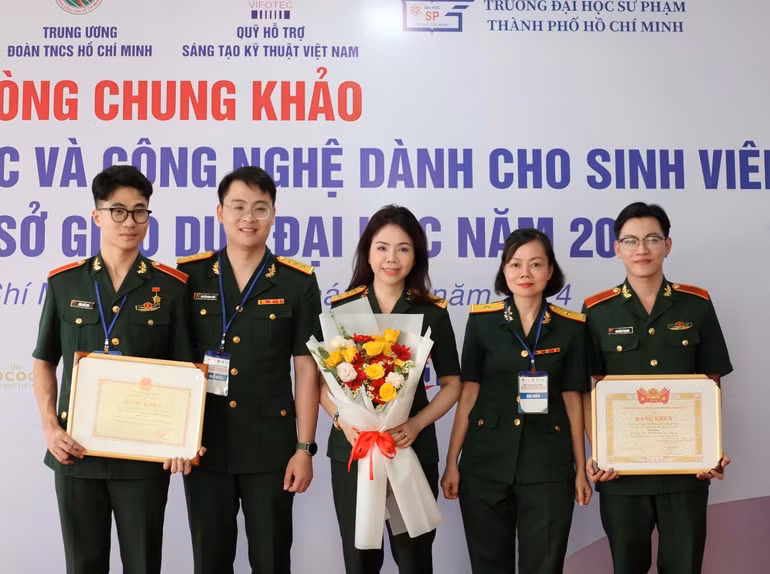 Thượng sĩ Đồng Thế Long (đứng giữa) thay mặt nhóm nghiên cứu nhận giải Nhất Giải thưởng khoa học và công nghệ dành cho sinh viên trong các cơ sở giáo dục đại học năm 2024.