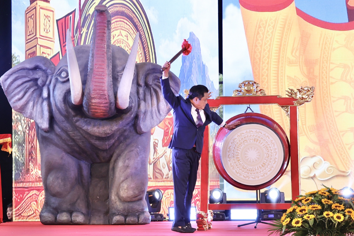 Ông Trần Thanh Hoài, Phó Bí thư Đảng ủy, Chủ tịch UBND xã Mê Linh, Hà Nội, thực hiện nghi thức đánh trống khai hội
