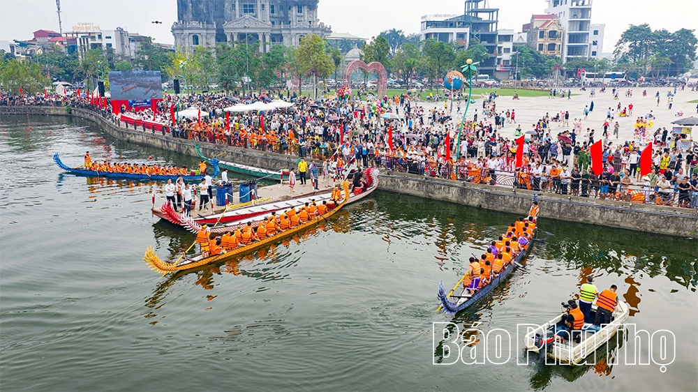 Sự tương phản giữa những tòa nhà cao tầng và nhịp chèo truyền thống, khẳng định sức sống bền bỉ của văn hóa Đất Tổ giữa dòng chảy thời gian.