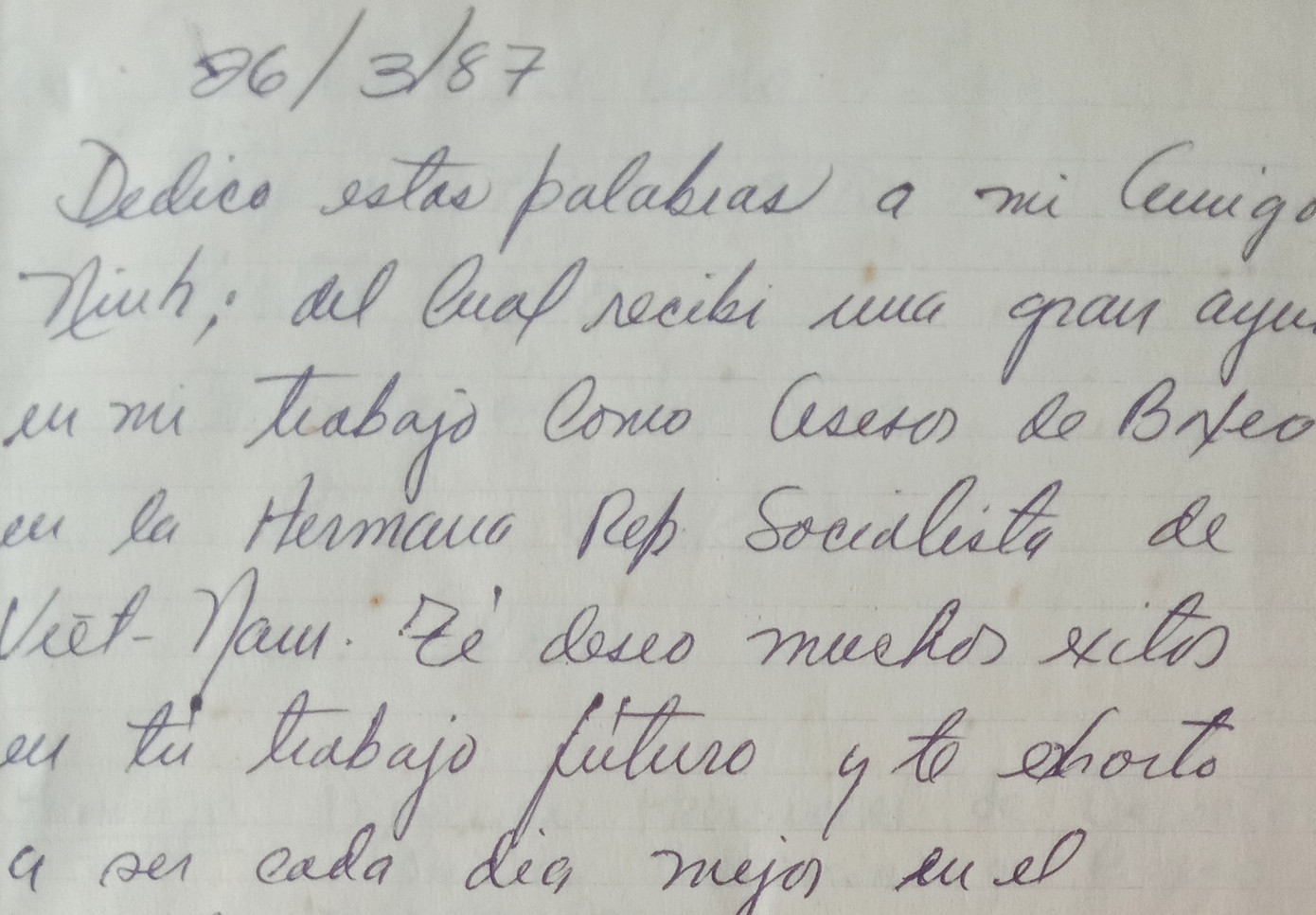 Lưu bút của huấn luyện viên Cu Ba, ông Roberto gửi cho Nguyễn Ninh Ảnh: Văn Chương