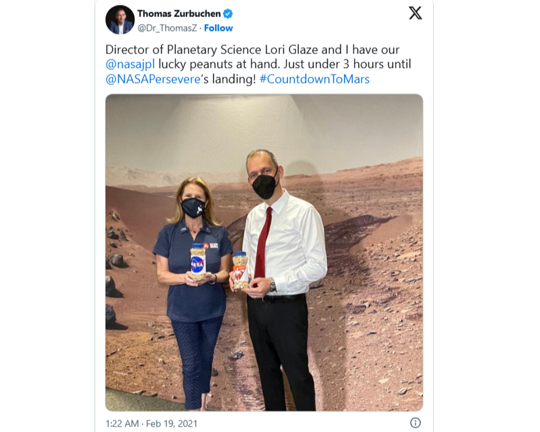 Phó giám đốc NASA (2016-2021) Thomas Zurbuchen đã đăng một bức ảnh lên tài khoản mạng xã hội của mình cùng hũ đậu phộng trên tay với niềm tin may mắn cho nhiệm vụ thành công. (Nguồn: Today)