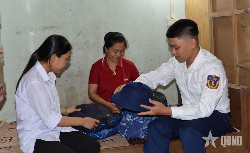 Mẹ và em gái sắp xếp quân trang cho thanh niên Nguyễn Ngọc Viên, sinh 2002, ở thôn Sơn Bằng, xã Lộc Hà chuẩn bị cho ngày nhập ngũ.