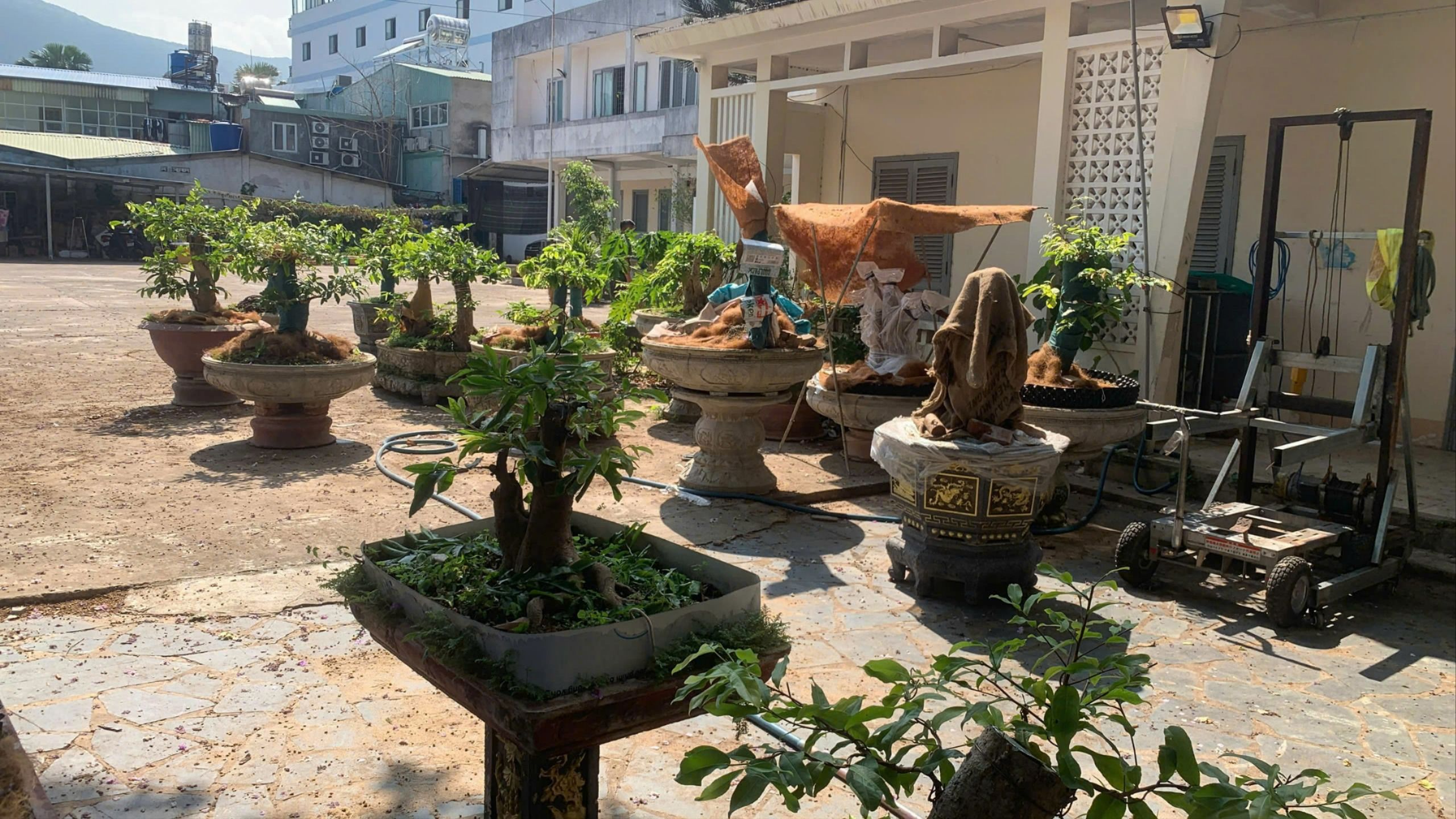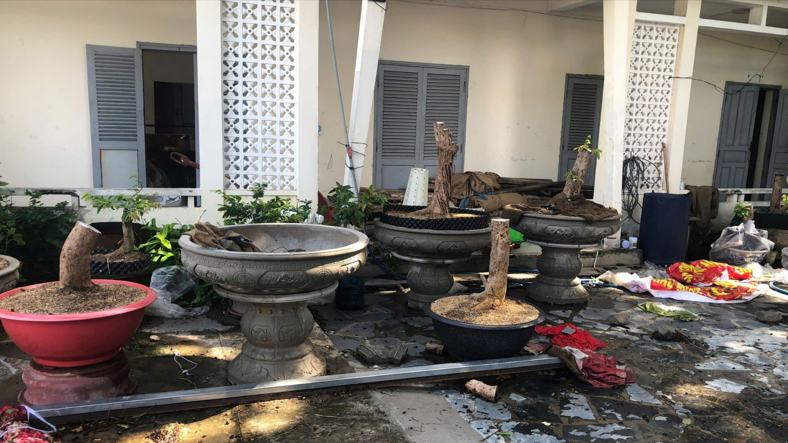 Đây là sân trụ sở cũ của một đơn vị trên địa bàn Côn Đảo. Sau khi có trụ sở mới, phần lớn đơn vị đã chuyển đi, còn lại một số người ở lại, trong đó có ông T. Các cây mai được cắt ngọn, trồng trong chậu để ở sân trụ sở.