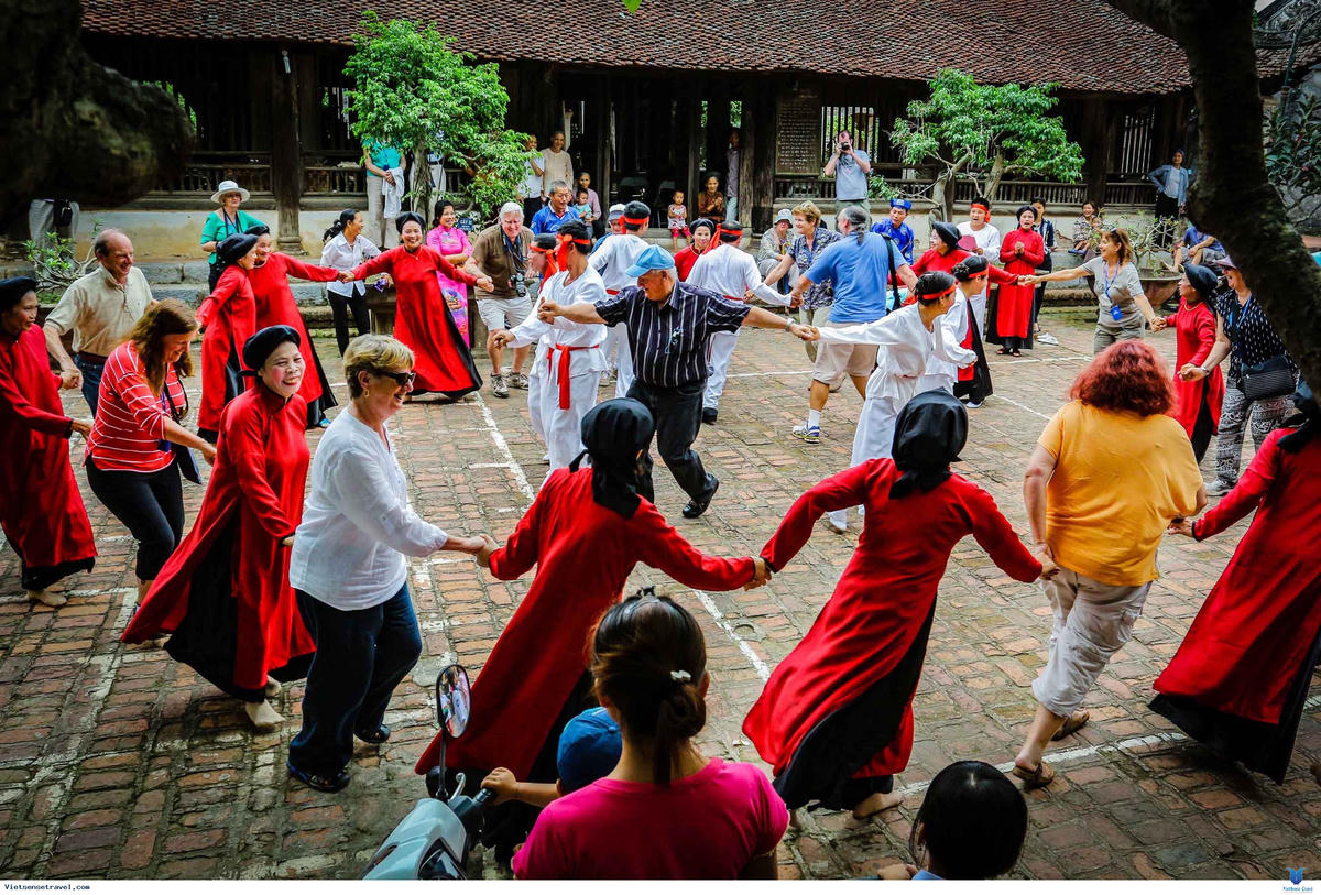 Du khách quốc tế trải nghiệm với các nghệ nhân hát Xoan tại đình Hùng Lô.