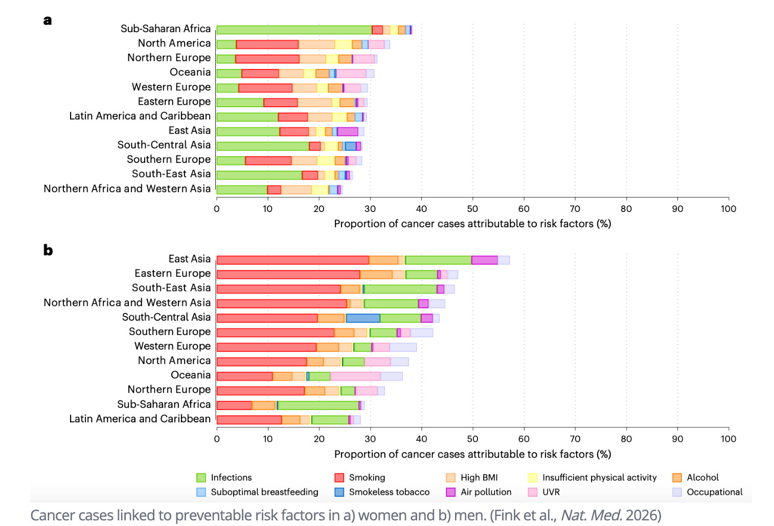 Biểu đồ của Nature Medicine cho thấy tỷ lệ ca ung thư liên quan đến các yếu tố nguy cơ có thể phòng ngừa có sự khác biệt đáng kể giữa các khu vực địa lý cũng như giữa nam và nữ.