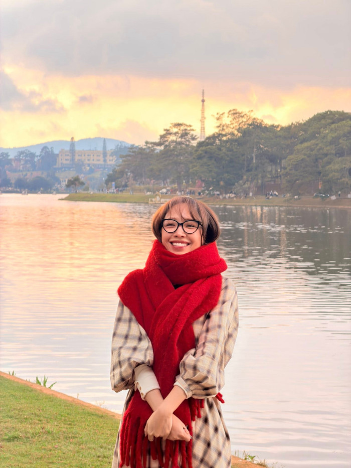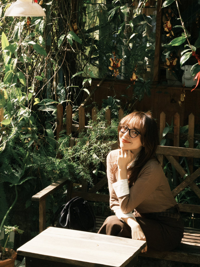 Tóc Tiên lựa chọn kiểu tóc mái thưa buông dài tự nhiên, mang lại cảm giác mềm mại và dịu dàng. Đi kèm là chiếc kính gọng tròn bản mảnh, phối cùng túi xách da đen đơn giản và giày thể thao để hoàn thiện tổng thể, vừa thoải mái, trẻ trung nhưng vẫn giữ được nét tinh tế.