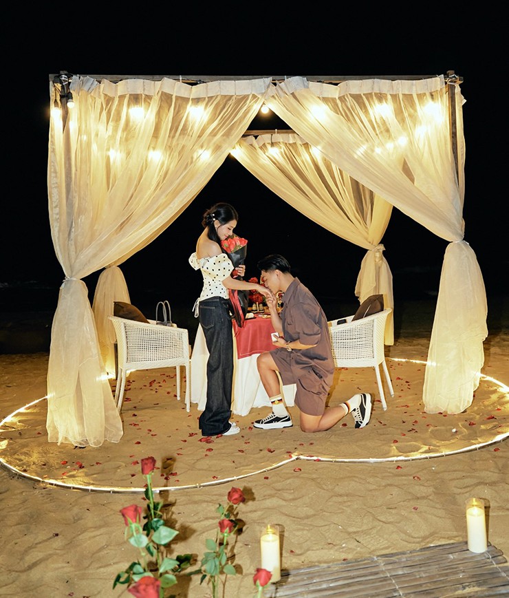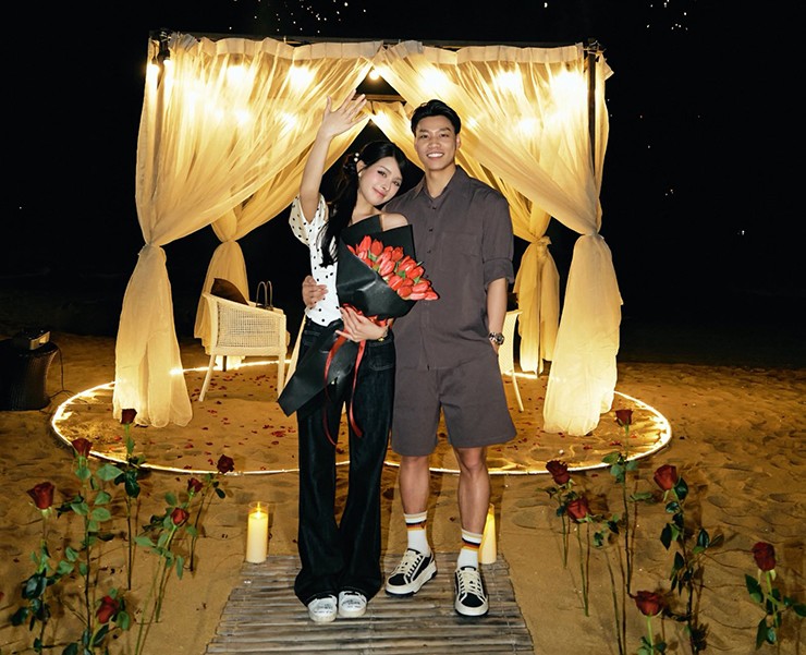 Không chọn những địa điểm ồn ào hay phô trương, chiều ngày 14/4, Vũ Văn Thanh đã tạo dấu ấn bằng một không gian riêng tư bên bờ biển nhân dịp sinh nhật mình (Văn Thanh sinh ngày 14/4/1996). Trong ánh hoàng hôn chuyển dần sang tối, hậu vệ sinh năm 1996 quỳ xuống trao nhẫn đúng khoảnh khắc pháo hoa bừng sáng, tạo nên khung cảnh vừa ấm áp vừa ấn tượng.