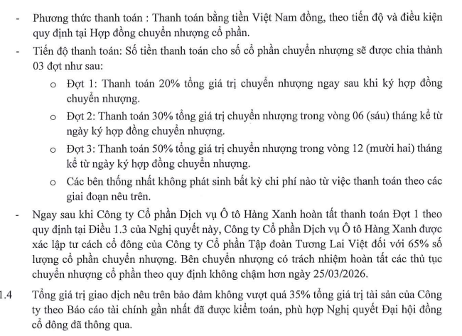 Ngay sau khi Haxaco hoàn tất thanh toán đợt 1, công ty sẽ được xác lập tư cách cổ đông của Tập đoàn Tương Lai Việt đối với 65% số cổ phần chuyển nhượng.