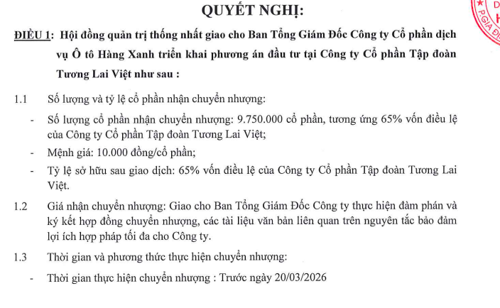 Cụ thể, Haxaco dự kiến nhận chuyển nhượng 9,75 triệu cổ phần, tương ứng 65% vốn điều lệ của Tập đoàn Tương Lai Việt. Sau khi hoàn tất giao dịch, Haxaco sẽ chính thức trở thành cổ đông chi phối tại doanh nghiệp này.