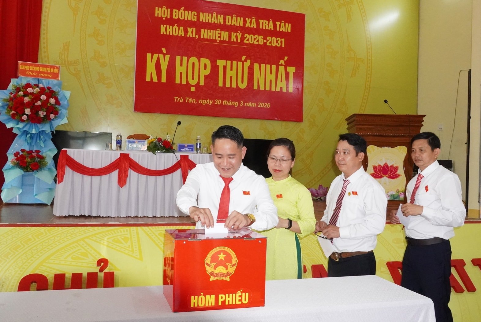 Tiếp đó, HĐND xã Trà Tân bầu các chức danh lãnh đạo chủ chốt của HĐND và UBND xã. Ông Nguyễn Hồng Lai, Bí thư Đảng ủy xã được bầu giữ chức Chủ tịch HĐND xã khóa XI; ông Lê Minh Chiến, Phó Bí thư Đảng ủy xã được bầu giữ chức Chủ tịch UBND xã nhiệm kỳ 2026 - 2031.