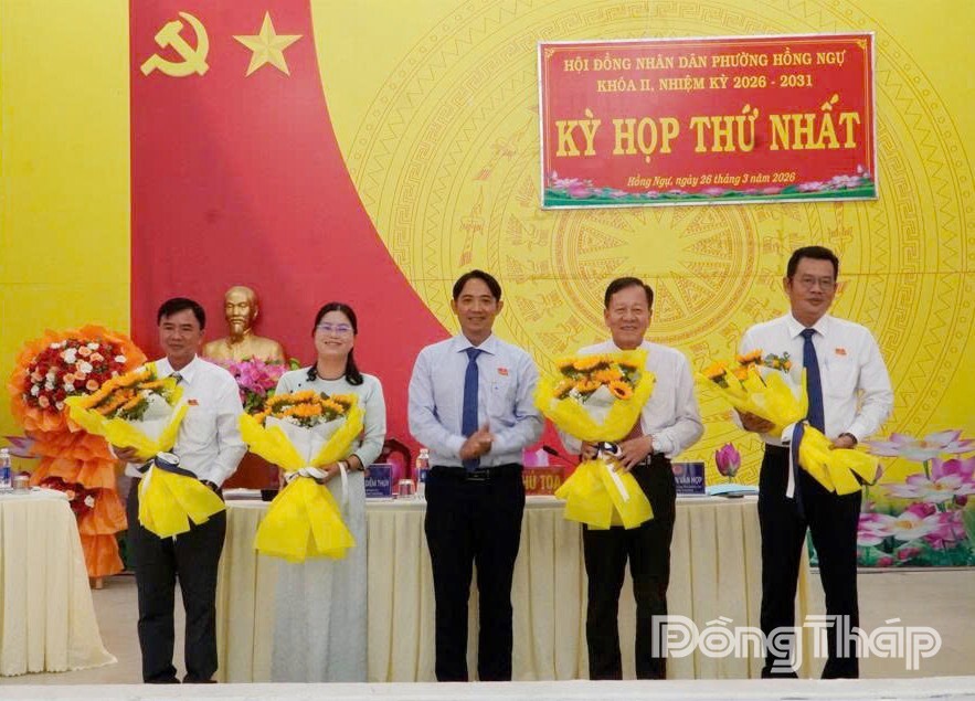 Đồng chí Võ Trọng Nghĩa, Phó Bí thư Thường trực Đảng ủy phường Hồng Ngự tặng hoa chúc mừng Thường trực Hội đồng nhân dân phường khóa II, nhiệm kỳ 2026 - 2031.