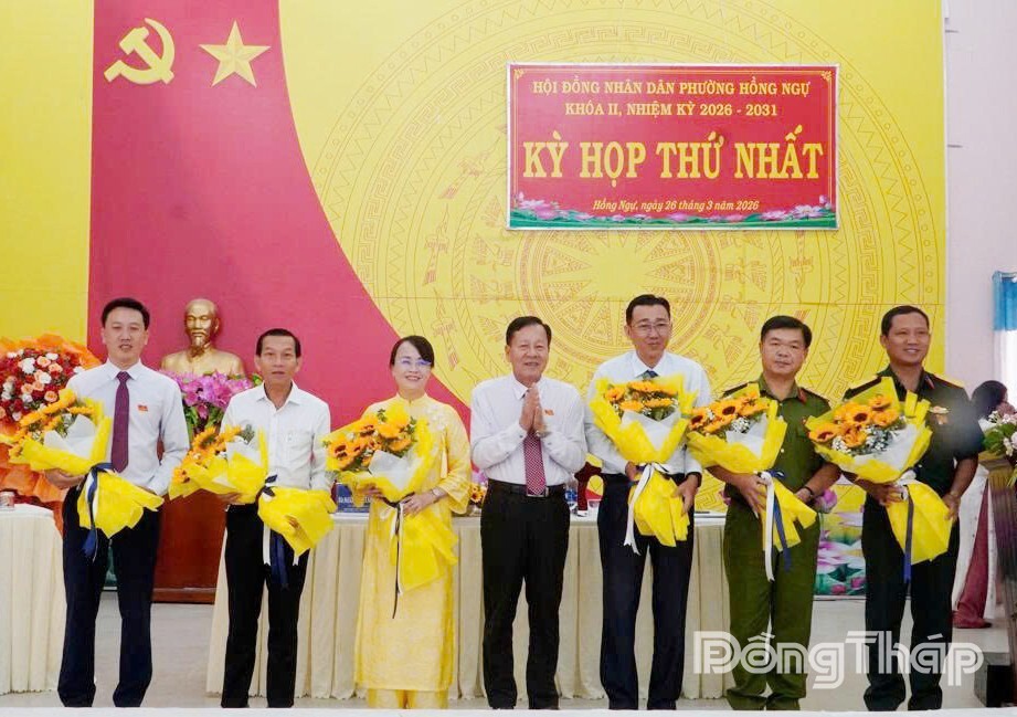 Đồng chí Phan Văn Hợp, Ủy viên Ban Thường vụ Tỉnh ủy, Bí thư Đảng ủy phường Hồng Ngự tặng hoa chúc mừng các đồng chí Ủy viên Ủy ban nhân dân phường nhiệm kỳ 2026 - 2031.