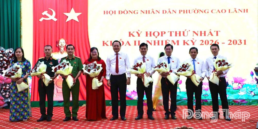 Đồng chí Nguyễn Hùng Tráng, Tỉnh ủy viên, Bí thư Đảng ủy phường Cao Lãnh tặng hoa chúc mừng các đồng chí Ủy viên Ủy ban nhân dân phường nhiệm kỳ 2026 - 2031.