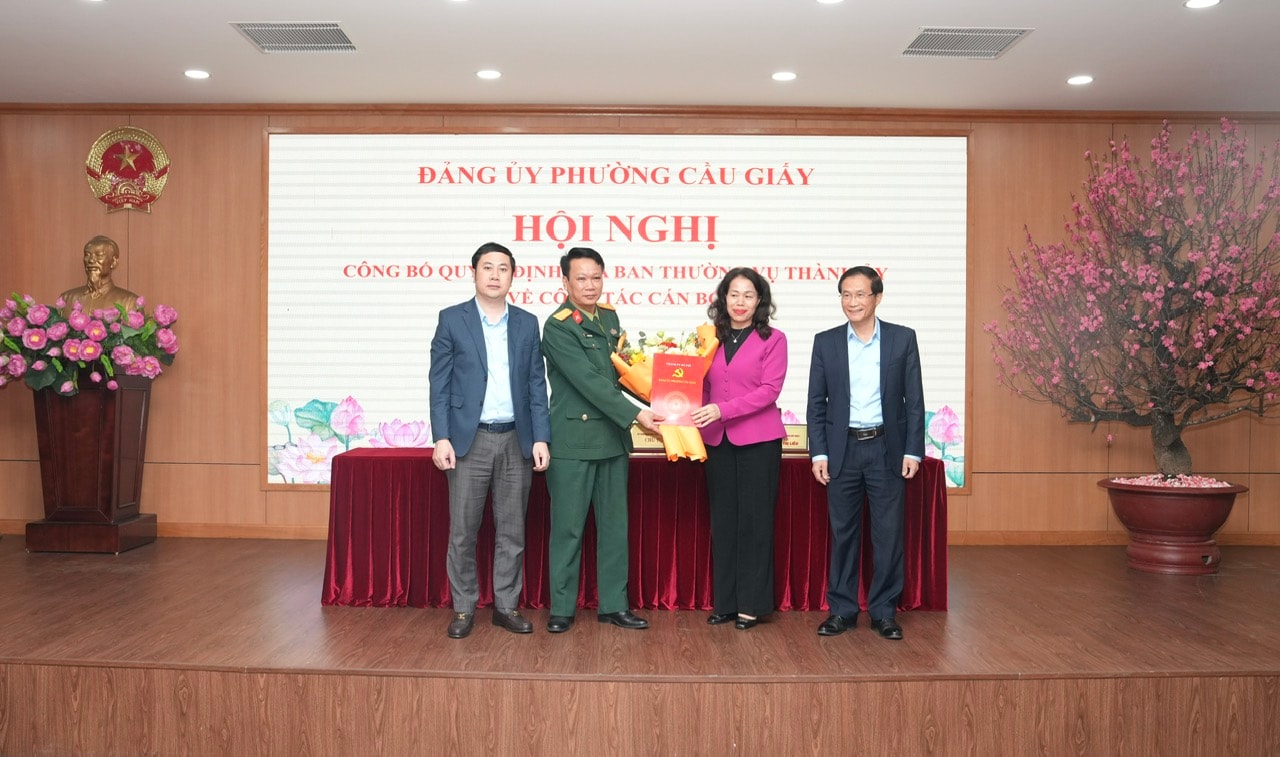 Lãnh đạo phường Cầu Giấy tặng hoa, chúc mừng ông Nguyễn Đình Đẩu - Chỉ huy trưởng Ban Chỉ huy quân sự phường. Ảnh: PV
