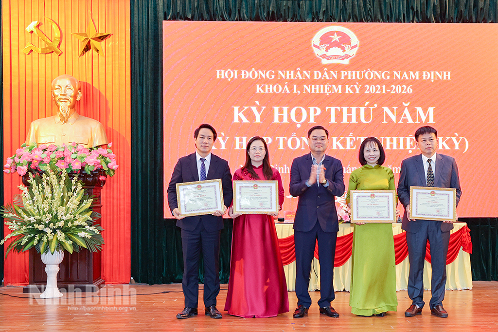 Đồng chí Chủ tịch UBND phường Nam Định Phạm Hồng Thái tặng Giấy khen các tập thể có thành tích trong hoạt động HĐND phường, khóa I, nhiệm kỳ 2021-2026.