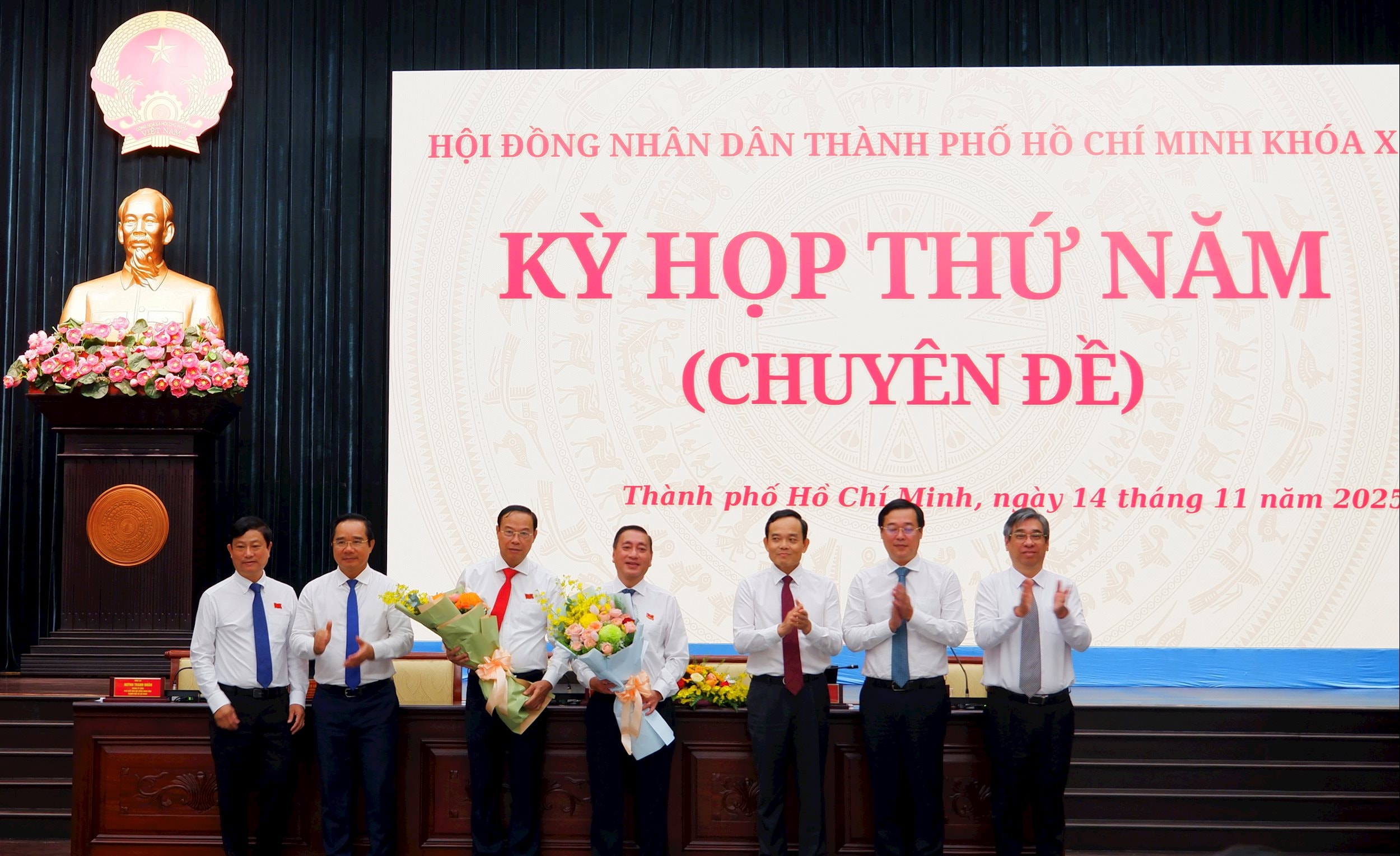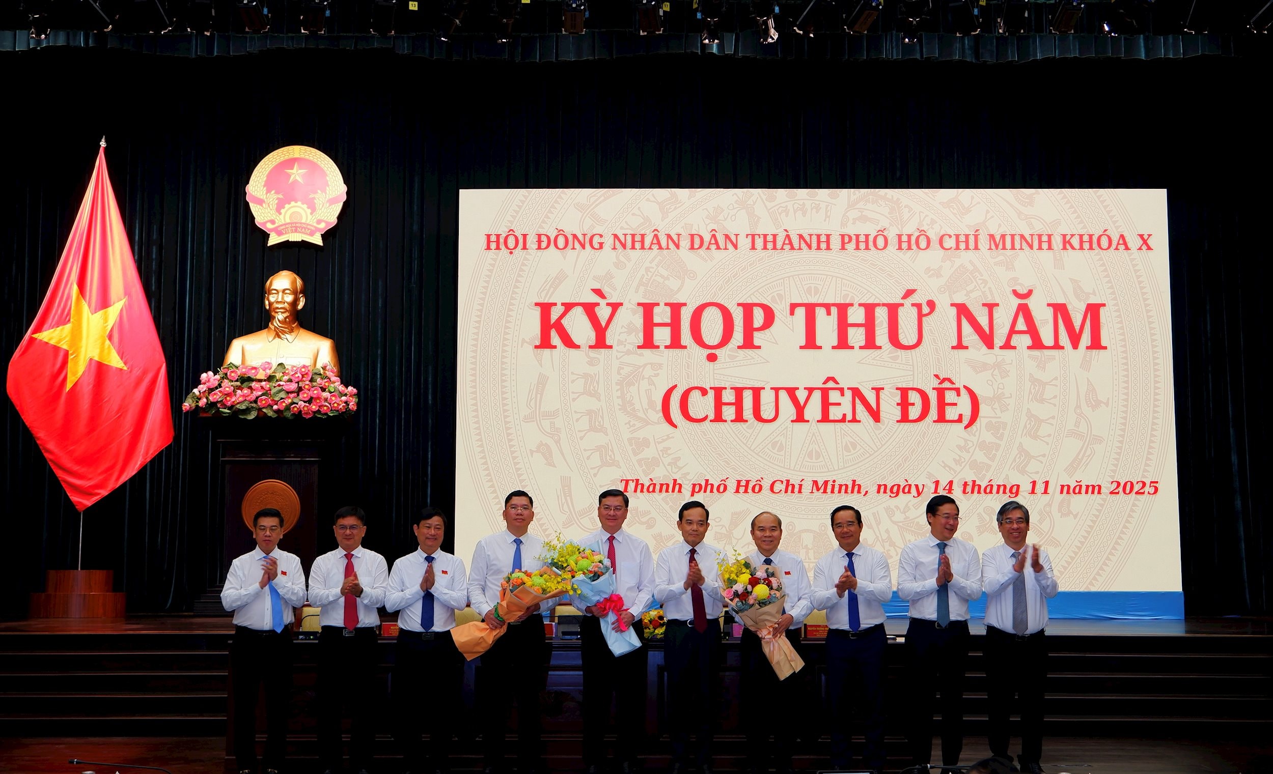 Lãnh đạo thành phố Hồ Chí Minh tặng hoa chúc mừng các Phó Chủ tịch UBND thành phố vừa được bầu.