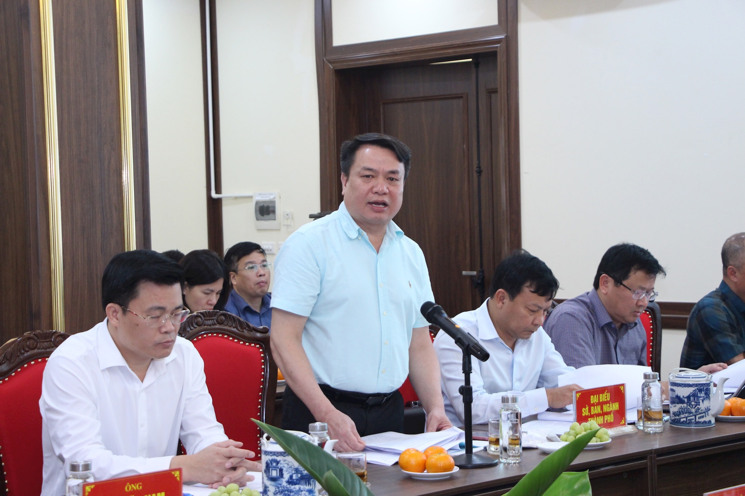 Phó Giám đốc Ban quản lý dự án Đầu tư xây dựng công trình hạ tầng kỹ thuật và Nông nghiệp Đàm Văn Hân báo cáo tiến độ các dự án thoát nước trên địa bàn phường Đông Ngạc. Ảnh: Thành An