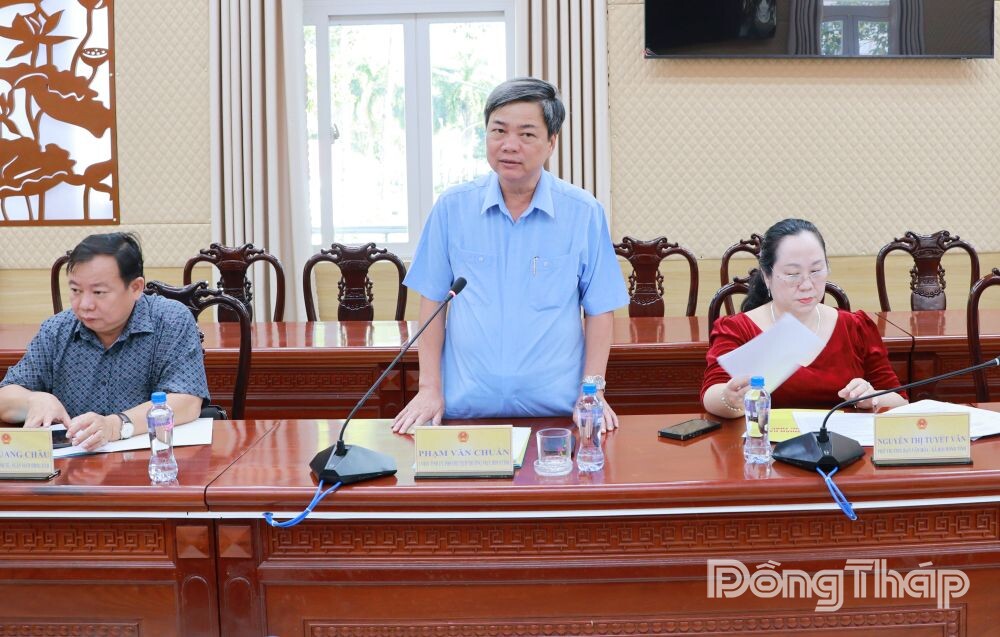 Đồng chí Phạm Văn Chuẩn, Ủy viên Ban Thường vụ Tỉnh ủy, Phó Chủ tịch Hội đồng nhân dân tỉnh trao đổi với xã Tháp Mười về thực hiện các khoản thu đầu năm học 2025 - 2026.