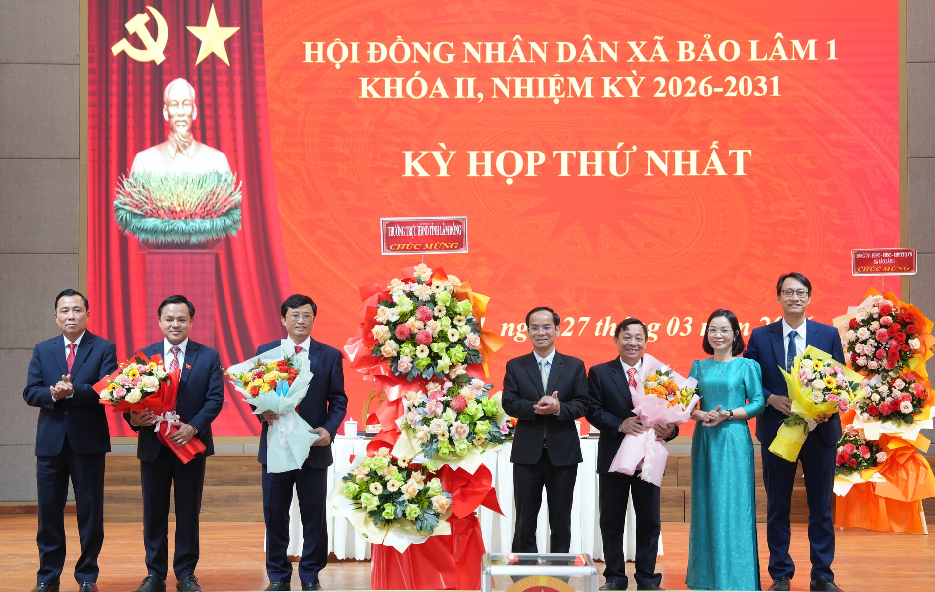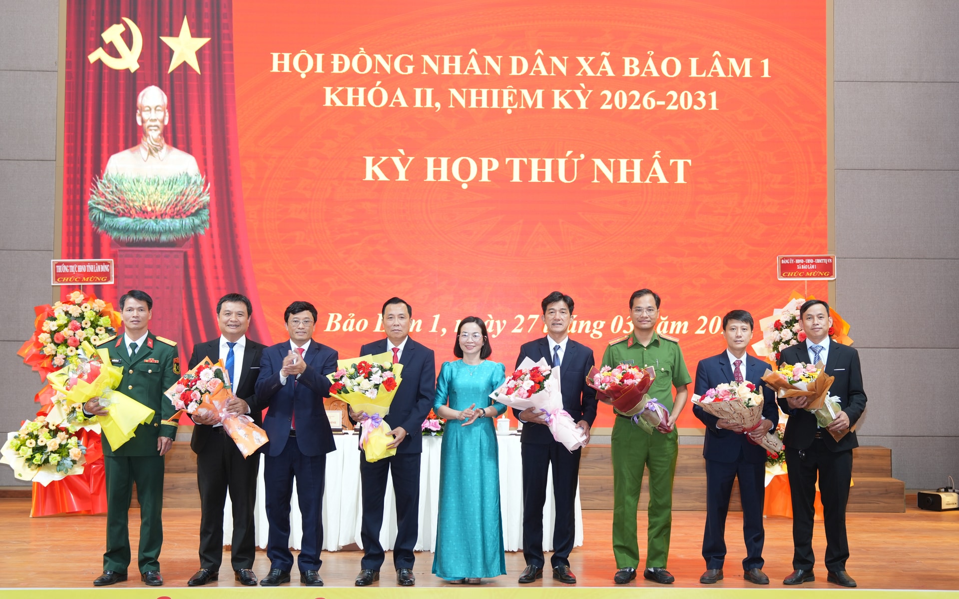 Ban Thường vụ Đảng ủy tặng hoa chúc mừng các đồng chí Chủ tịch, Phó Chủ tịch, Ủy viên UBND xã Bảo Lâm 1