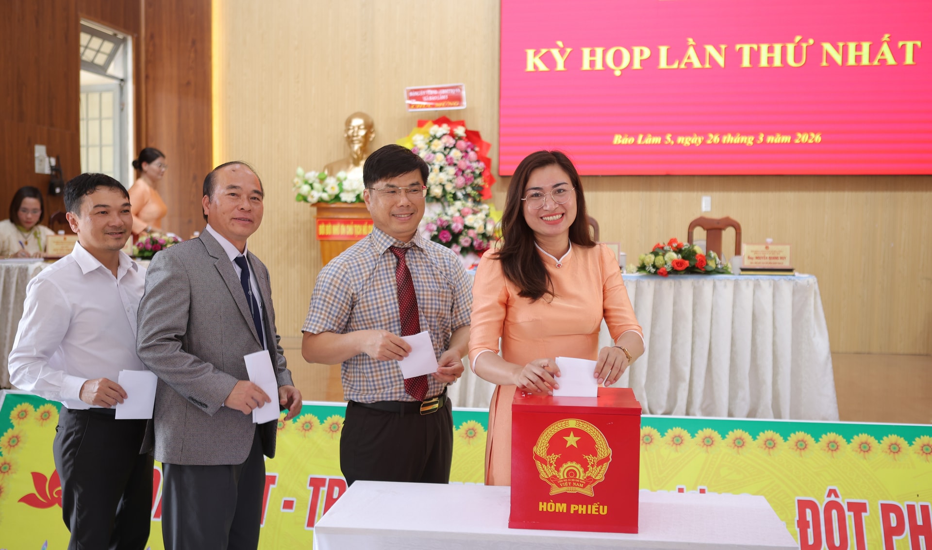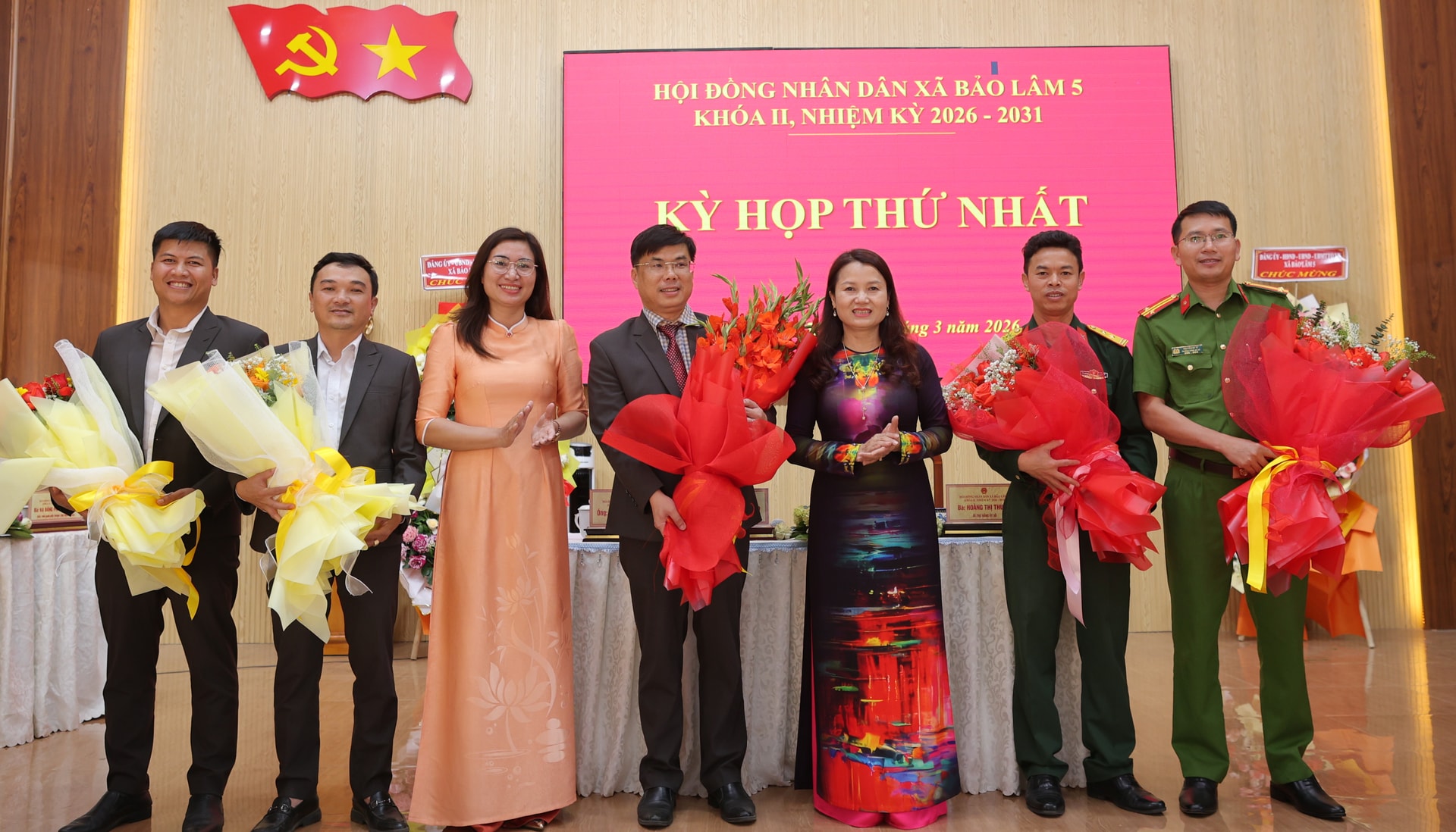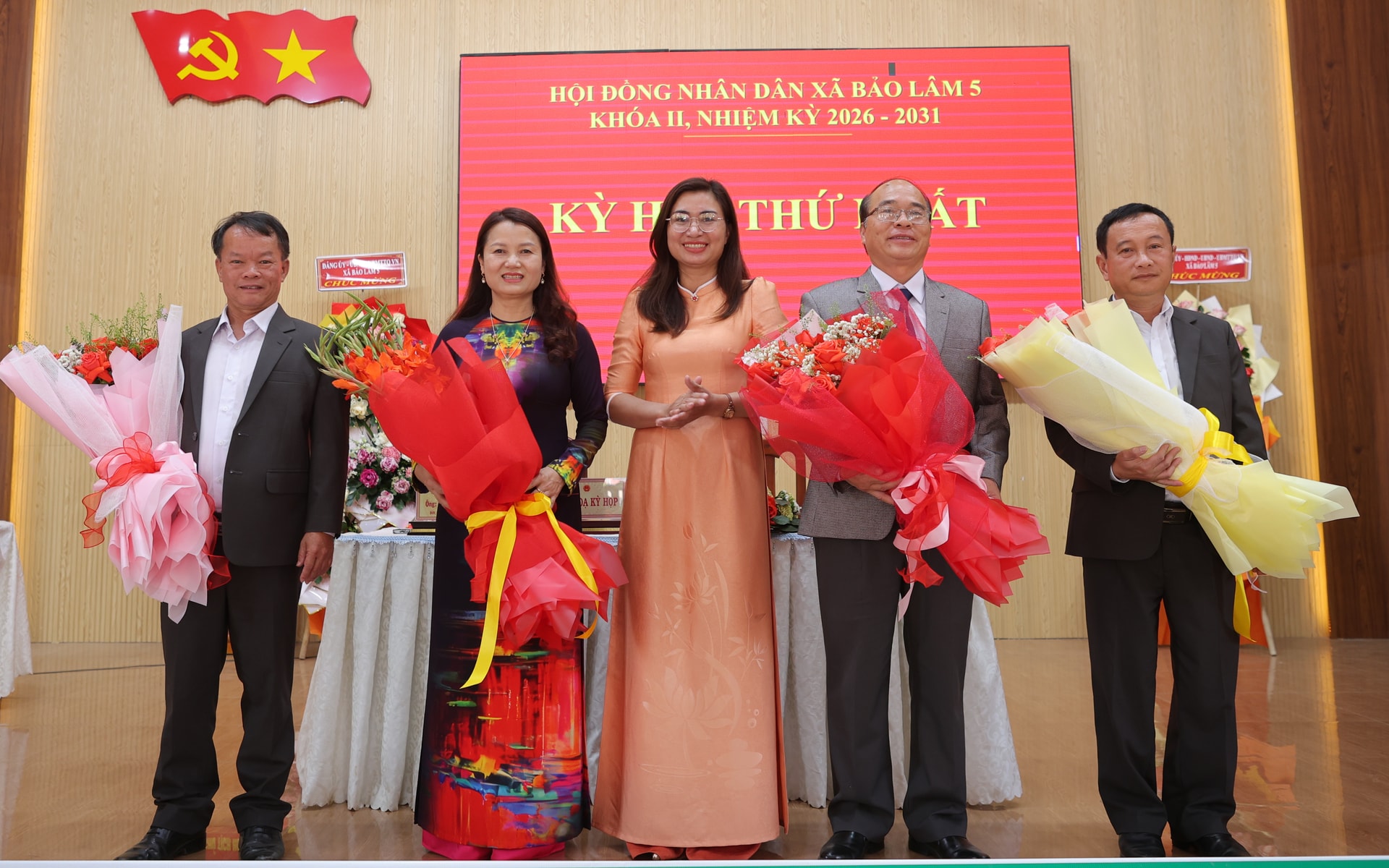 Tặng hoa chúc mừng các đồng chí được tín nhiệm bầu giữ chức Chủ tịch, Phó Chủ tịch HĐND, Trưởng các Ban của HĐND xã Bảo Lâm 5 nhiệm kỳ 2026-2031