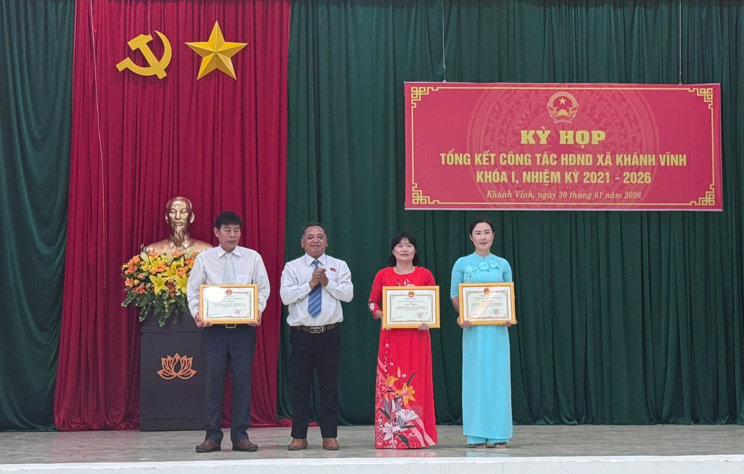 Dịp này, Chủ tịch UBND xã Khánh Vĩnh khen thưởng 3 tập thể và 16 cá nhân tiêu biểu trong hoạt động HĐND xã khóa I, nhiệm kỳ 2021 - 2026.