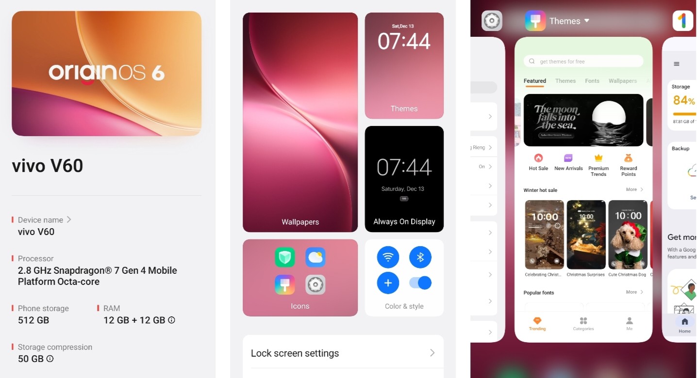 Bên cạnh đó, hệ thống chủ đề của OriginOS 6 tiếp tục là điểm mạnh với khả năng tùy biến sâu. Trên V60, người dùng có thể phối màu, bộ icon, hình nền, font chữ và cả hiệu ứng chuyển cảnh theo một tông xuyên suốt. Khi đổi giao diện, hệ thống tự cân chỉnh màu bổ trợ, tránh hiện tượng lệch tông mà nhiều nền tảng khác hay gặp.