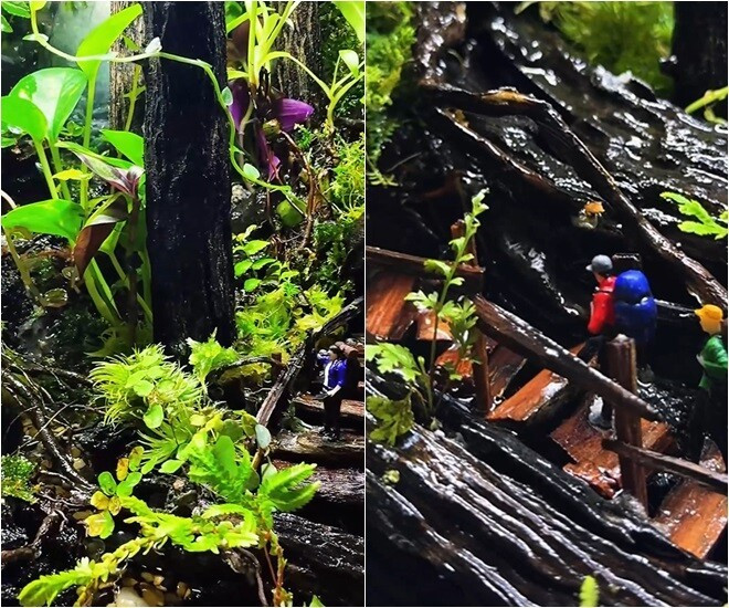 Elly Trần tỉ mỉ gắn mô hình người leo núi, đèn sáng, suối nước trong nhà tí hon. Ảnh chụp màn hình