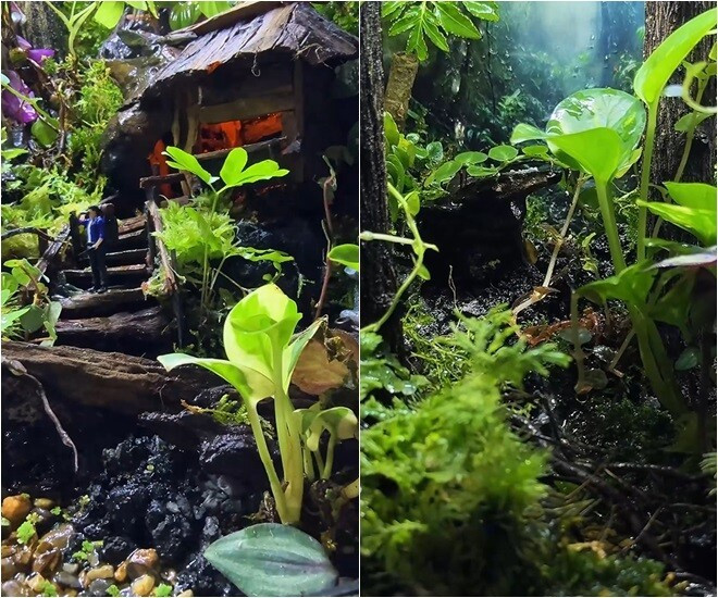 Không chỉ bên ngoài, trong nhà cũng ngập sắc xanh với bể thủy sinh. Cô mua cây, rêu để tái thiết lại bể terrarium theo phong cách mang "Đà Lạt về Sài Gòn". Ảnh chụp màn hình