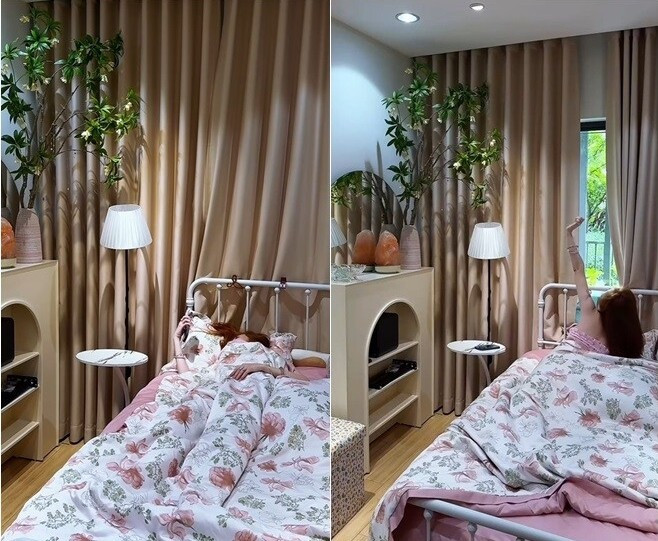 Phòng ngủ dịu nhẹ với tông màu pastel, cây xanh điểm xuyết tạo điểm nhấn. Ảnh: chụp màn hình