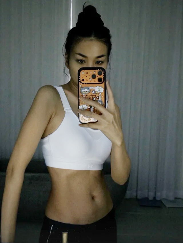 Mới đây, Thanh Hằng gây chú ý khi chia sẻ hình ảnh diện chiếc croptop màu trắng đơn giản nhưng khéo léo khoe vòng eo thon gọn cùng những múi cơ săn chắc. Cô bày tỏ kỷ luật giữ dáng ở tuổi 43: "Sáng nào thức dậy cũng bước liền lên hai cái cân".