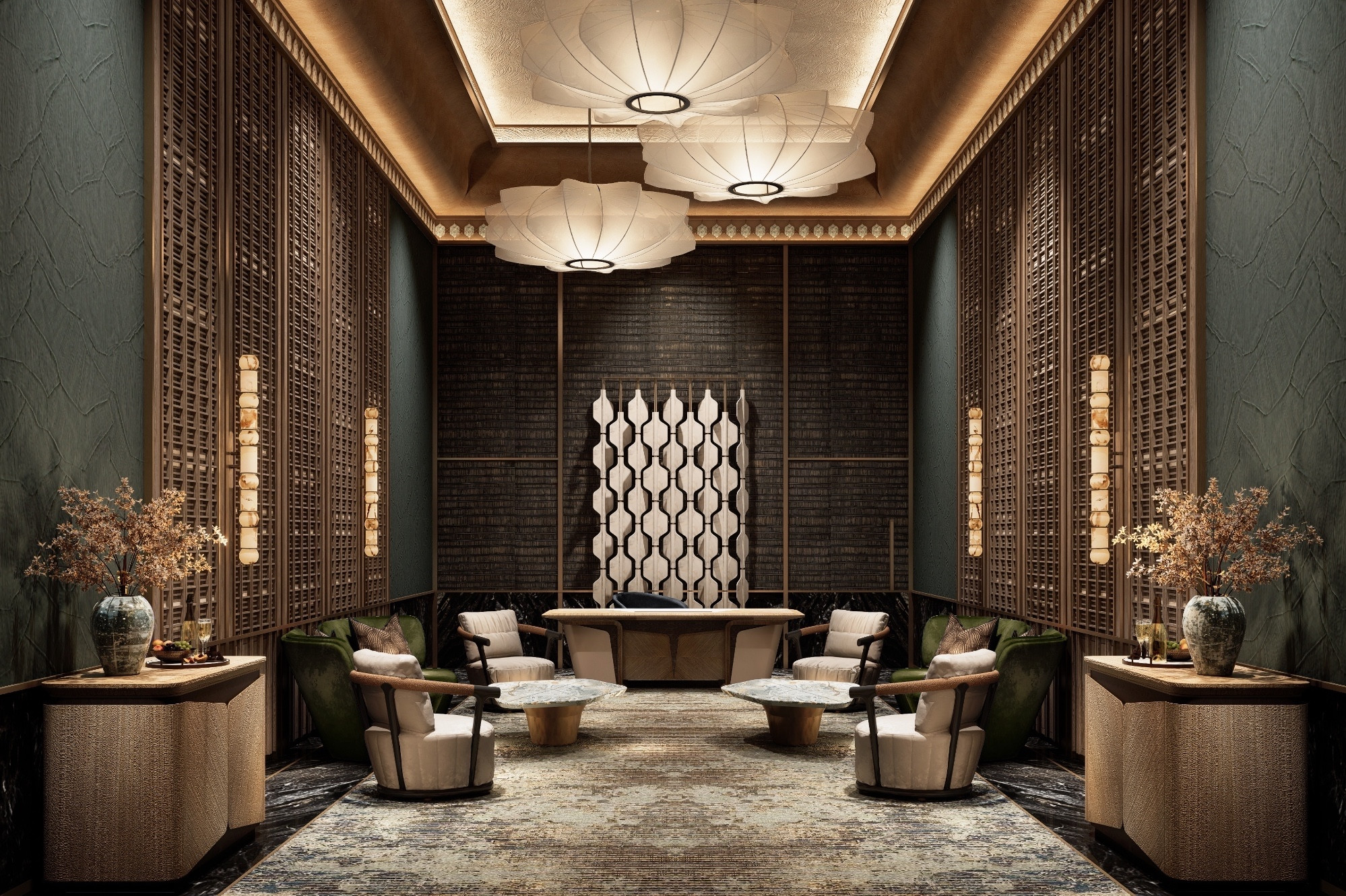 Khu vực chờ dành cho nguyên thủ quốc gia và các đoàn quan chức cấp cao được thiết kế riêng biệt, mang sắc thái trầm lắng hơn, gợi hình ảnh tầng sâu của đại dương. Không gian sử dụng các bề mặt đá obsidian đen bóng kết hợp đường chỉ kim loại ánh vàng, tạo nên vẻ sang trọng kín đáo.
