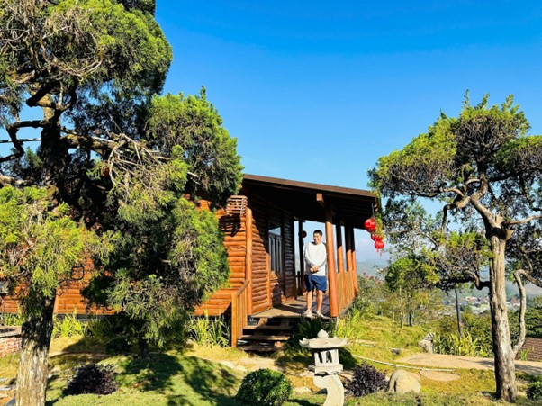 Biệt phủ được xây dựng theo phong cách nhà gỗ truyền thống, mang hơi hướng Á Đông. Hình ảnh tổng thể cho thấy công trình có mái ngói, cột gỗ lớn, tạo cảm giác bề thế nhưng vẫn gần gũi thiên nhiên.