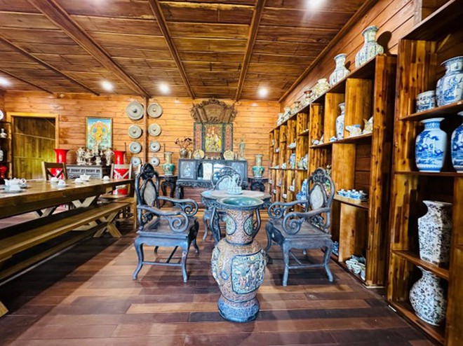 Không gian bên trong còn được trang trí bằng nhiều tượng gỗ, bình gốm và vật phẩm mỹ nghệ. Những chi tiết này thể hiện rõ gu thẩm mỹ cũng như niềm yêu thích văn hóa truyền thống của Hoàng Mập.