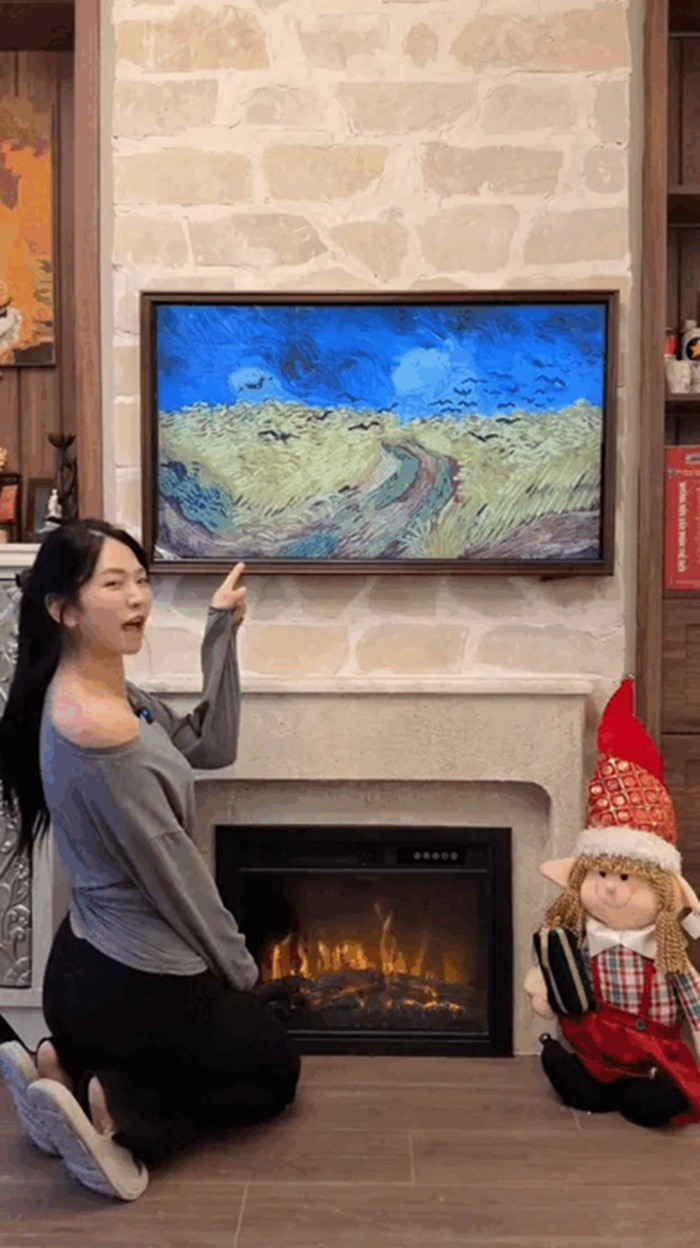 Trên tường, Lê Bống treo một chiếc tivi lớn kết hợp lò sưởi mini bên dưới, tạo điểm nhấn ấm áp. Ảnh chụp màn hình