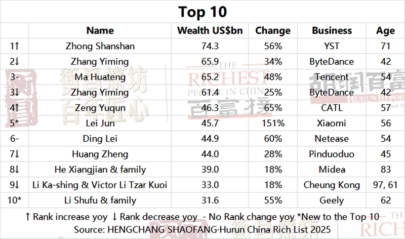 Danh sách top 10 người giàu nhất Trung Quốc 2025. Ảnh: Hurun Rich List.