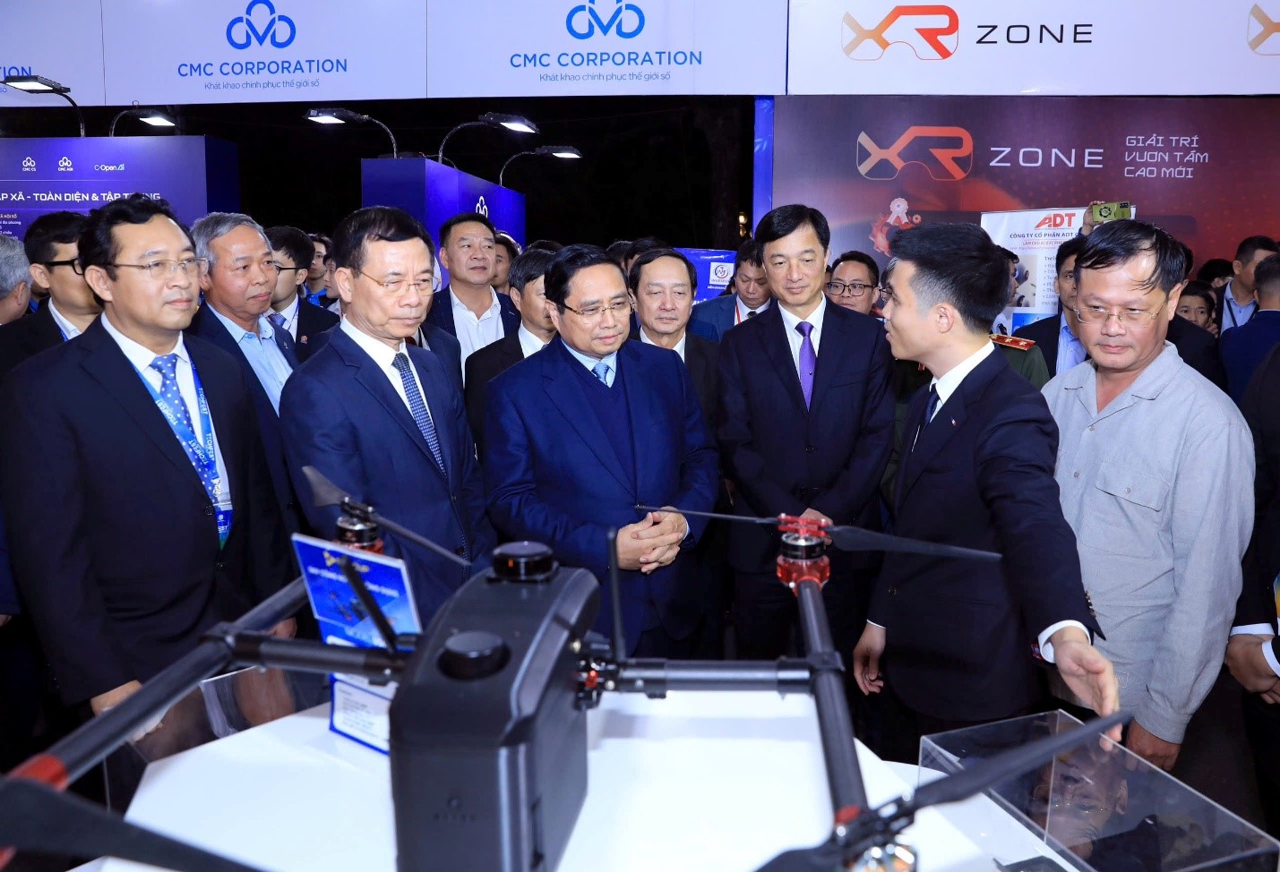 Thủ tướng Chính phủ Phạm Minh Chính và lãnh đạo Bộ Khoa học và Công nghệ, Hà Nội tham quan các gian hàng giới thiệu sản phẩm công nghệ mới tối ngày 13/12.