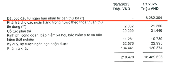 Cụ thể, đặt cọc đầu tư ngắn hạn nhận từ bên thứ ba trước đây đạt 18.282 tỷ đồng, thì nay lại không ghi nhận con số nào. Việc này dựa theo các hợp đồng hợp tác kinh doanh mà doanh nghiệp này cam kết cung cấp lợi tức đầu tư trên số tiền đặt cọc nhận được cho bên thứ ba theo mức quy định trong hợp đồng hợp tác kinh doanh.