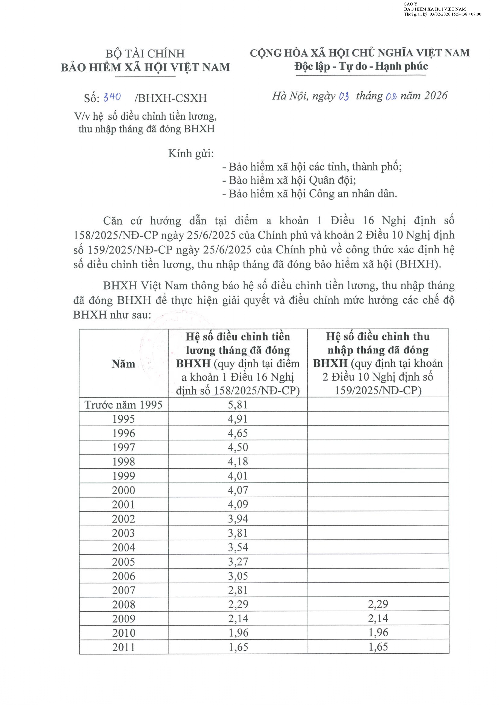 Bảo hiểm xã hội Việt Nam ban hành Công văn số 340/BHXH-CSXH ngày 03/02/2026 gửi Bảo hiểm xã hội các tỉnh, thành phố; Bảo hiểm xã hội Quân đội; Bảo hiểm Công an nhân dân về hệ số điều chỉnh tiền lương, thu nhập tháng đã đóng bảo hiểm xã hội.