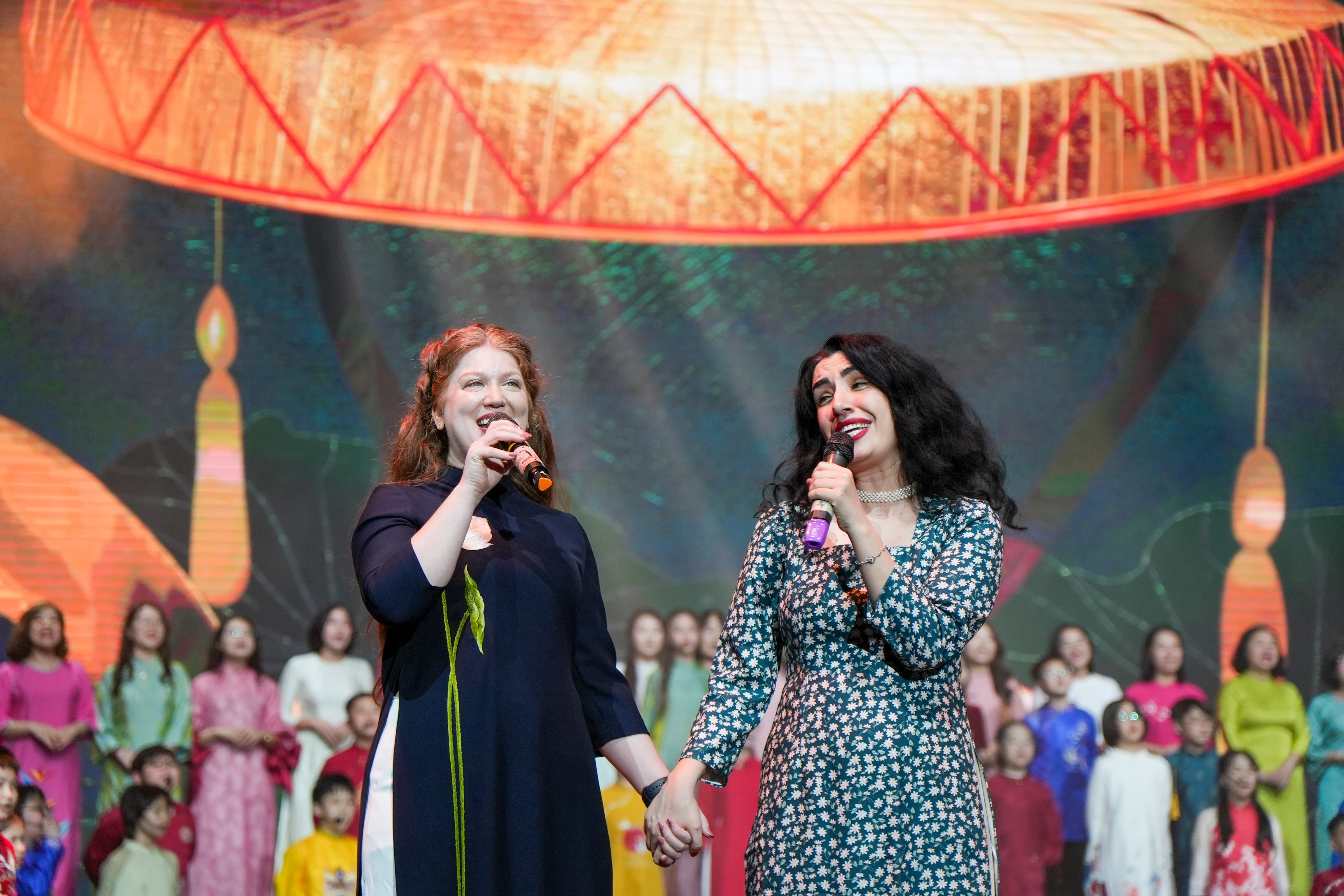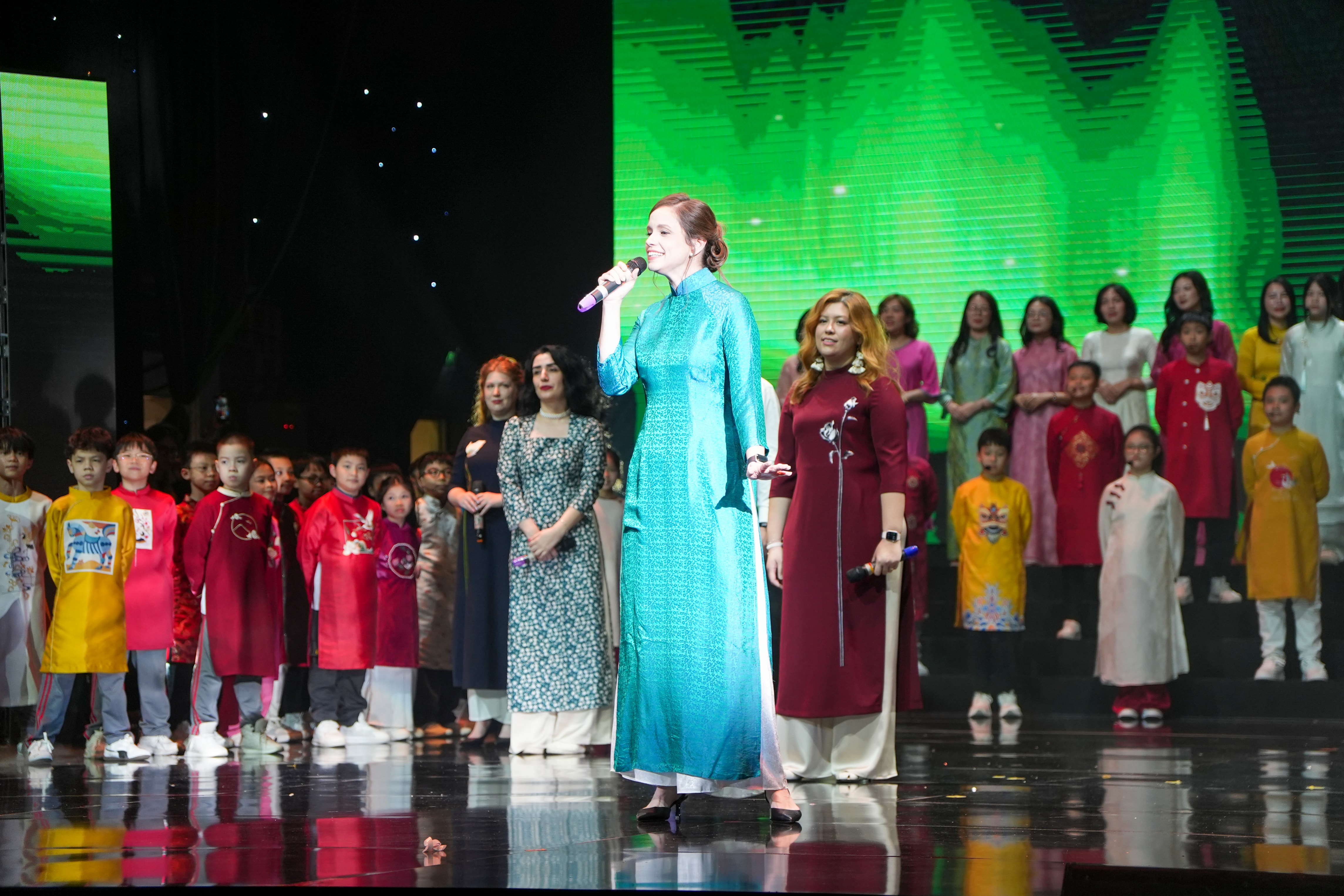 Một khoảnh khắc đặc biệt gây xúc động là khi gần 10 giáo viên nước ngoài của nhà trường cùng cất lên những làn điệu dân ca Việt Nam trong liên khúc “Bèo dạt mây trôi – Đi cấy”. Không cầu kỳ dàn dựng, các thầy cô xuất hiện giản dị, hát tiếng Việt tròn vành rõ chữ, mang đến cảm giác mộc mạc nhưng ấm áp.