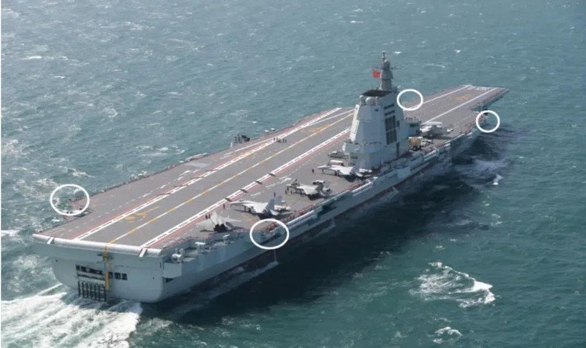 Vị trí lắp đặt các tổ hợp vũ khí chống người nhái trên tàu sân bay Phúc Kiến. Ảnh: QQnews.