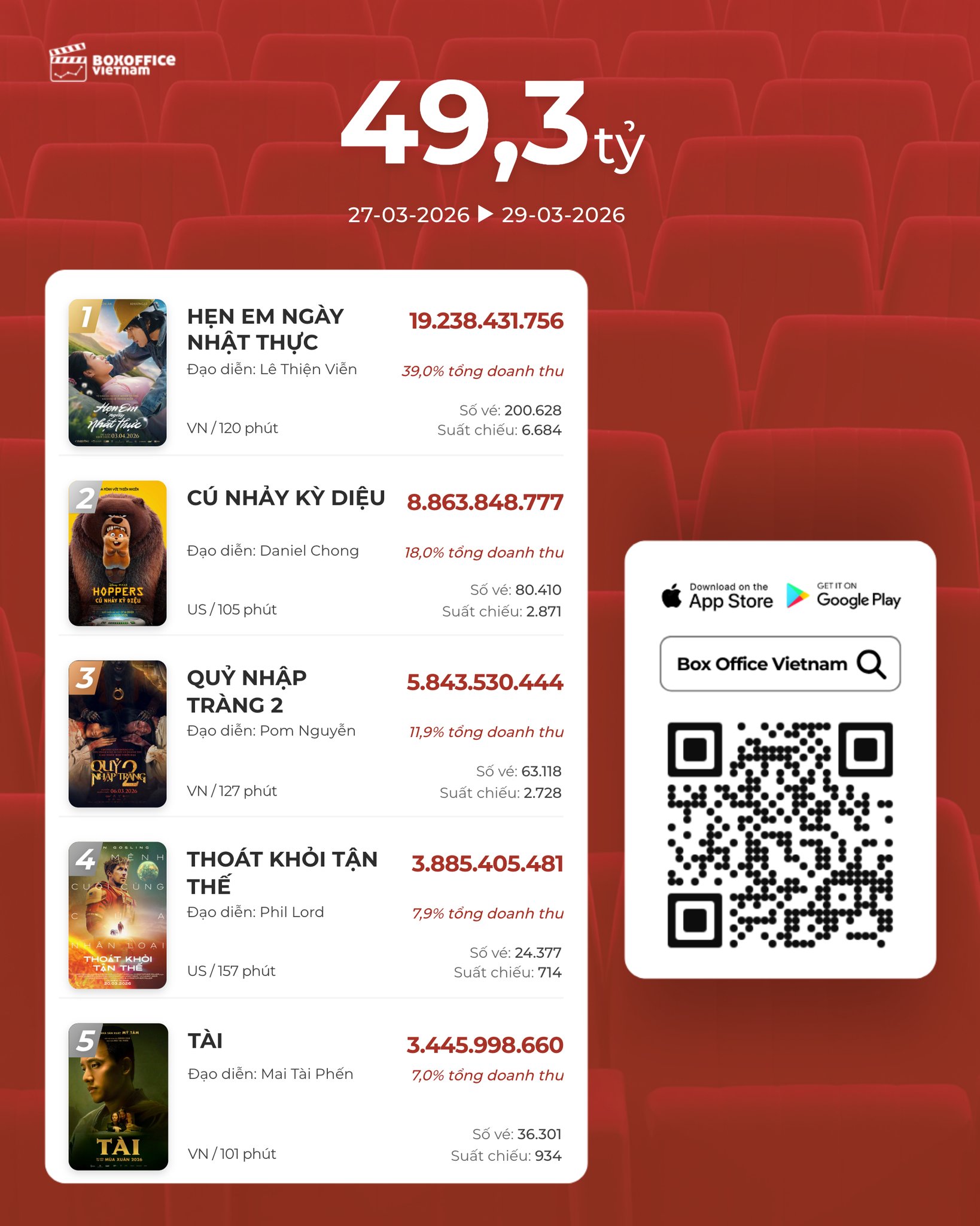 Theo số liệu của Box Office Vietnam (đơn vị quan sát phòng vé độc lập", phim "Hẹn em ngày nhật thực" đứng đầu phòng vé Việt về doanh thu dịp cuối tuần qua (27-29/3).
