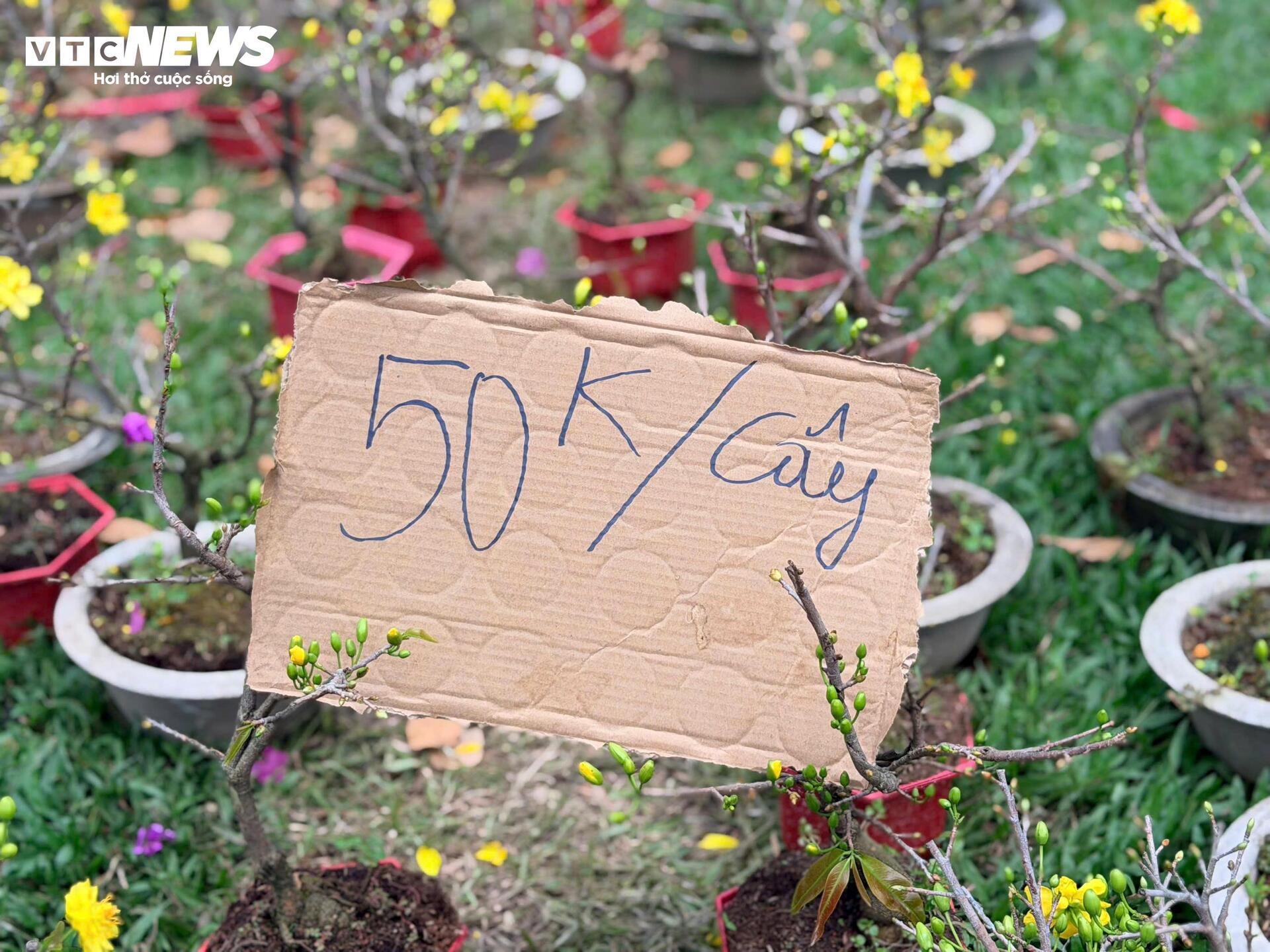 Tại chợ hoa ở công viên Làng Hoa (phường Thông Tây Hội, TP.HCM), không khí xả hàng cũng diễn ra sôi động. Nhiều tiểu thương treo biển giảm giá lớn để bán nốt số cây còn lại. Mai nhỏ trước đó bán khoảng 300.000 đồng/chậu, nay hạ xuống chỉ còn 50.000 đồng/chậu.
