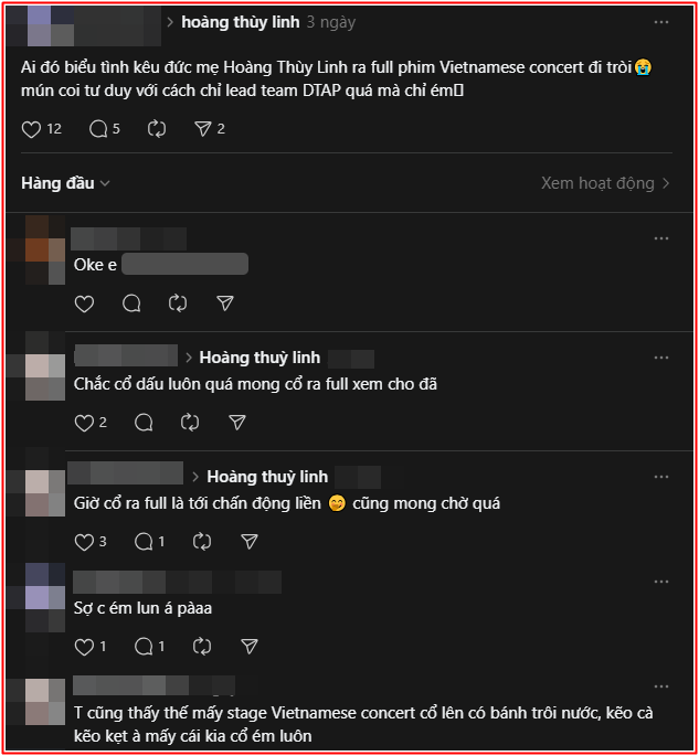 Nội dung bài viết được diễn đạt theo cách hài hước, gần gũi: "Ai đó biểu tình kêu đức mẹ Hoàng Thùy Linh ra full phim Vietnamese Concert đi trời. Muốn coi tư duy với cách chỉ lead team DTAP quá mà chỉ ém". Dưới phần bình luận, không ít người bày tỏ sự đồng tình, cho rằng bộ phim tài liệu này xứng đáng được phát hành rộng rãi hơn, nhất là trong bối cảnh nhiều khán giả đã bỏ lỡ suất chiếu ngoài rạp vì thời gian công chiếu khá giới hạn.