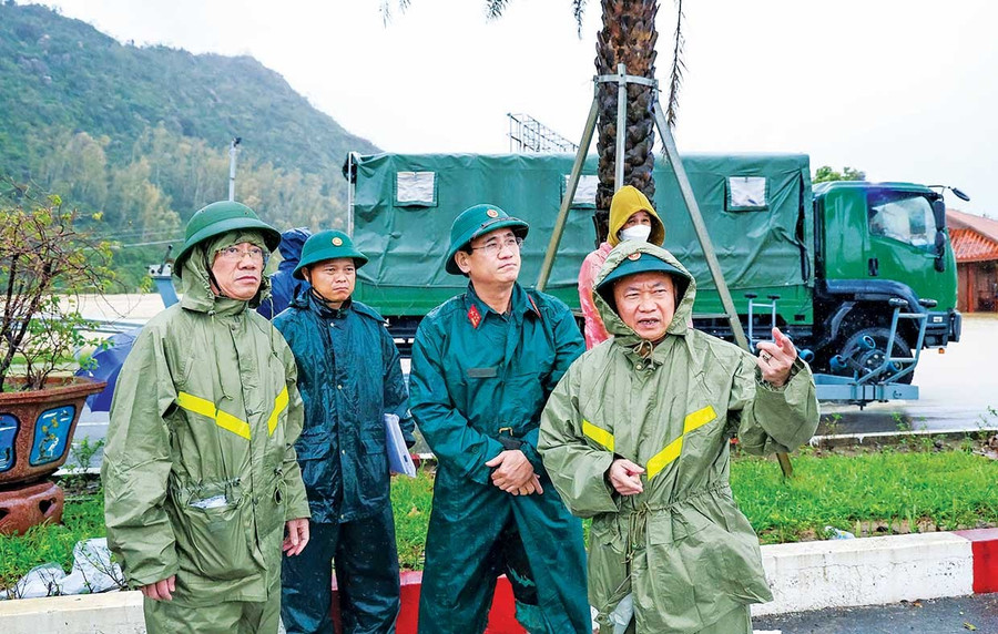 Bí thư Tỉnh ủy Thái Đại Ngọc (bìa phải) và Chủ tịch UBND tỉnh Phạm Anh Tuấn (bìa trái) chỉ đạo ứng phó lũ tại phường Quy Nhơn Bắc. Ảnh: Nguyễn Dũng