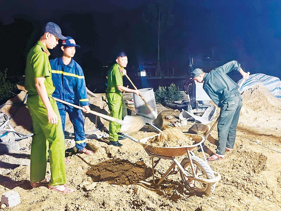 Tổ công tác "Chiến dịch Quang Trung" của Công an tỉnh tại địa bàn xã Đề Gi phân chia lực lượng, khẩn trương làm việc 3 ca liên tục ngày đêm, xây nhà cho gia đình ông Nguyễn Bá Hồng. Ảnh: Q. Hiền