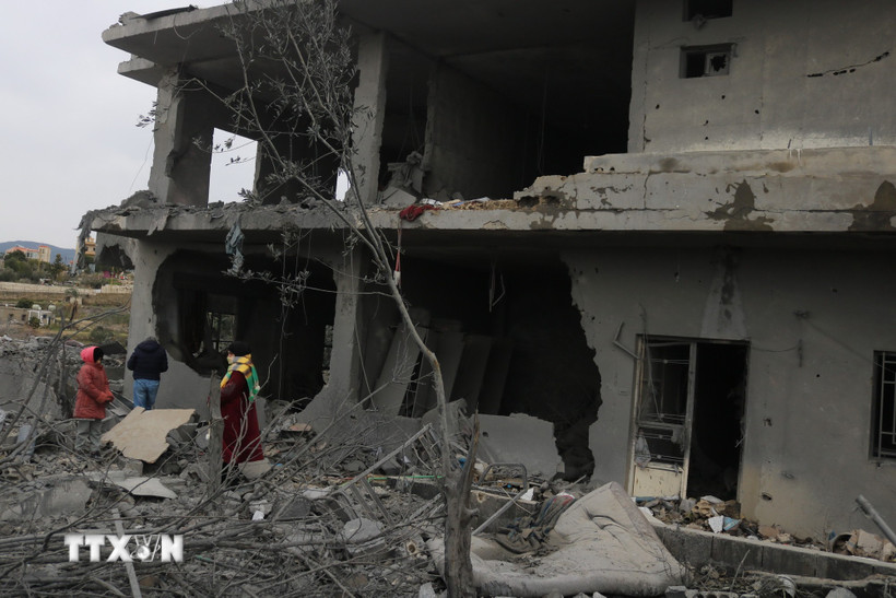 Tòa nhà bị phá hủy sau cuộc không kích của Israel tại thị trấn Kfour, gần Nabatieh, miền Nam Liban. (Ảnh: THX/TTXVN)
