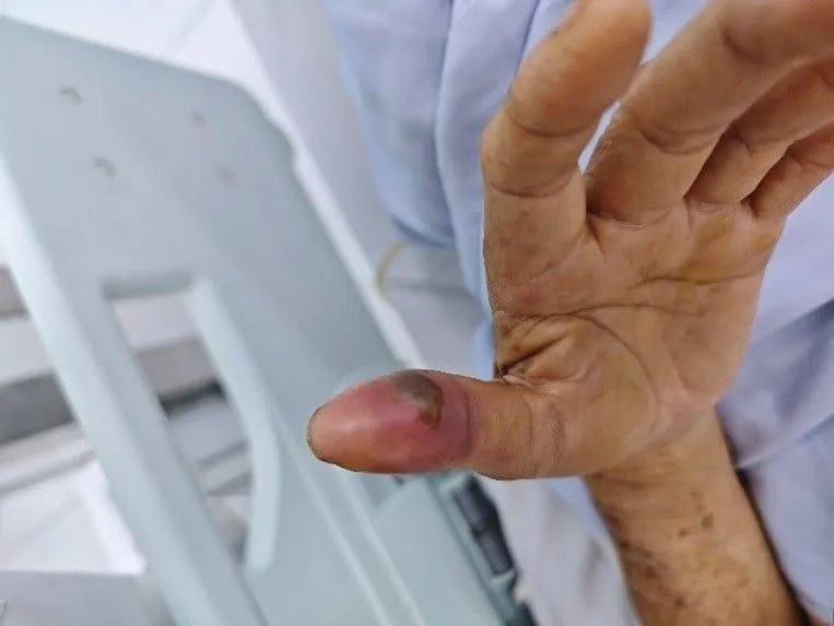 Người bệnh nhập viện trong tình trạng tỉnh táo, sinh hiệu ổn định nhưng ngón tay cái sưng đỏ, đau lan nhanh.